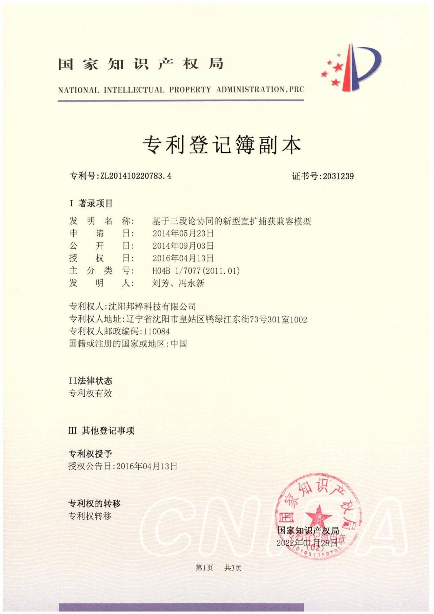基于三段論協(xié)同的新型直擴(kuò)捕獲兼容模型專利證書