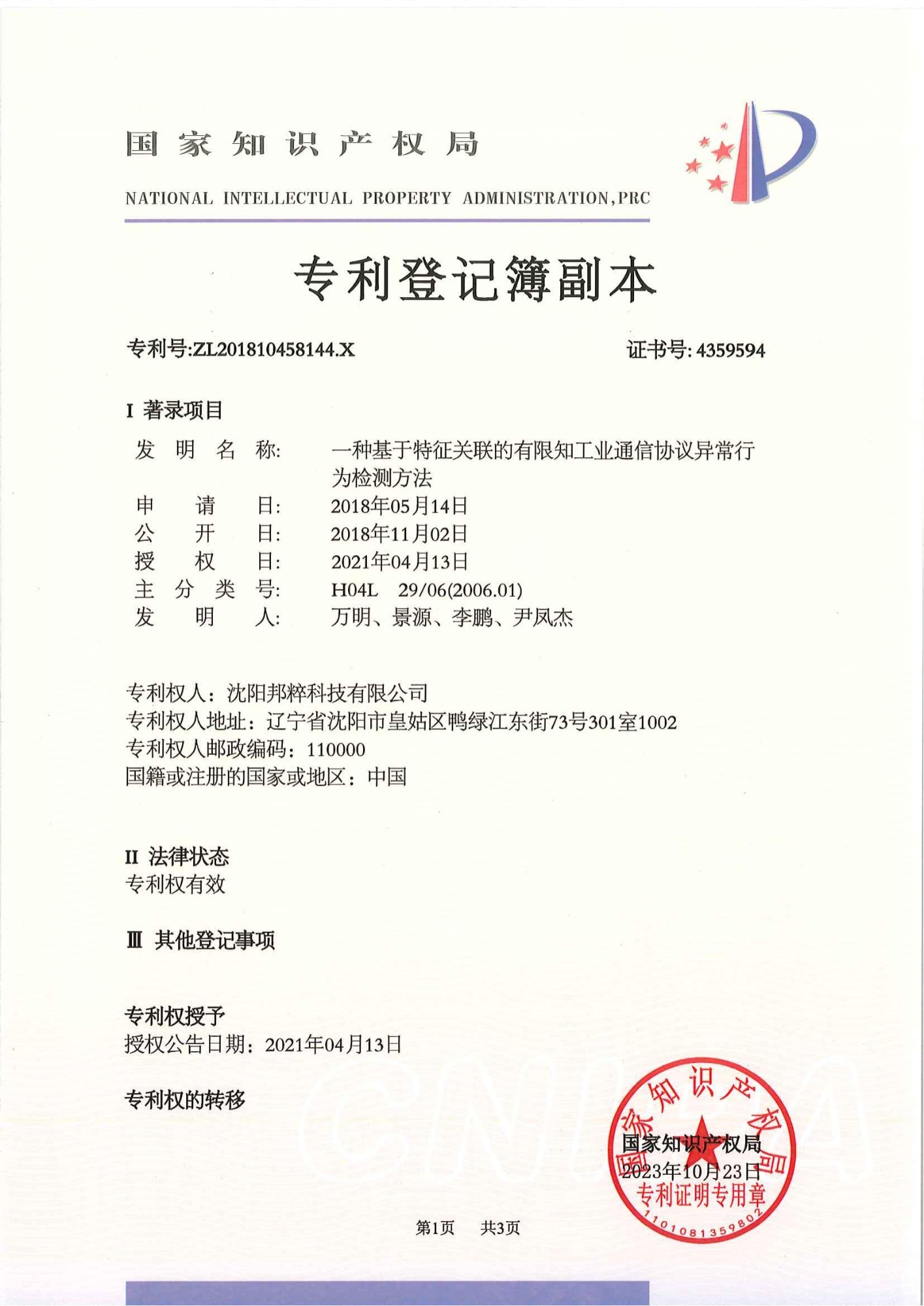 一種基于特征關(guān)聯(lián)的有限知工業(yè)通信協(xié)議異常行為檢測方法專利證書