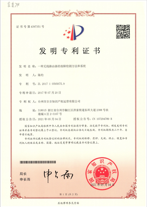 一種無線路由器的故障檢測方法和系統(tǒng)專利證書